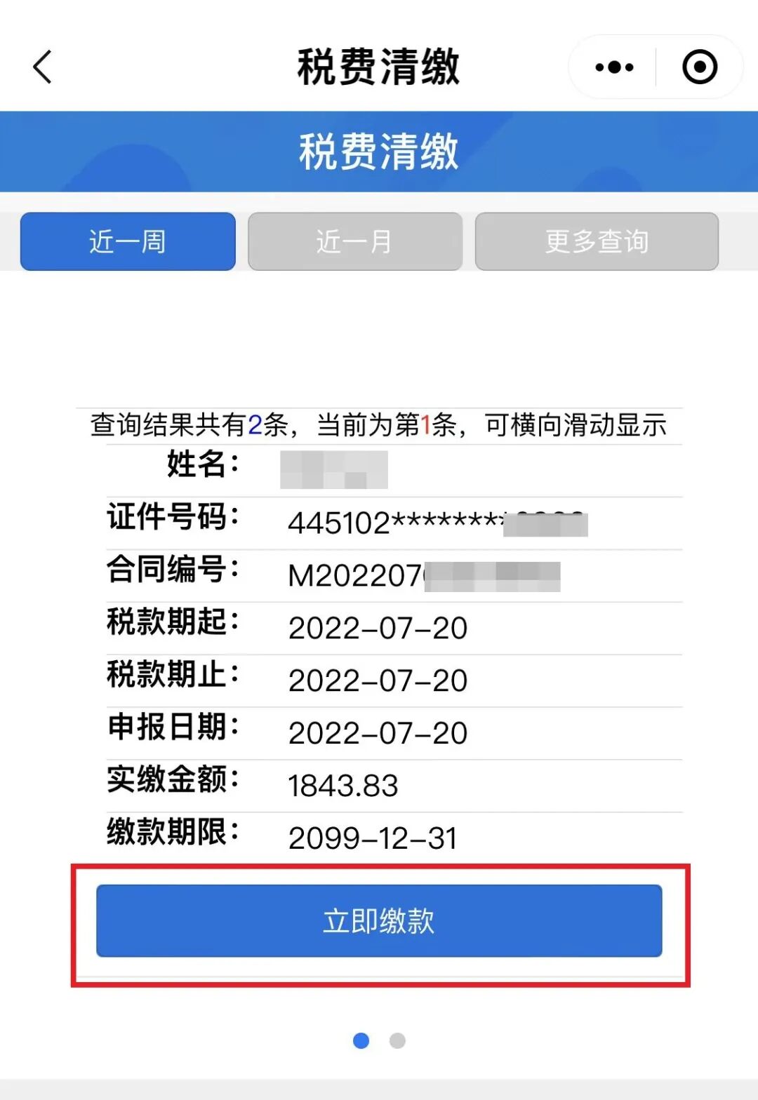 2左右滑动页面,确认买卖双方税费信息。确认无误后点击“立即缴款”。