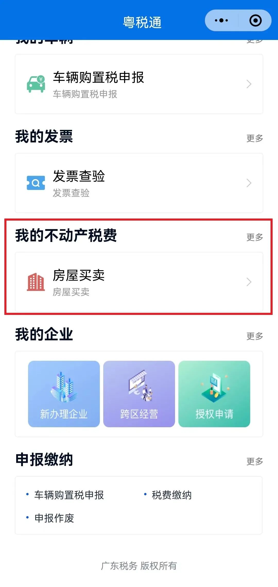 3 页面下拉找到“我的不动产税费”——“房屋买卖”,点击进入。