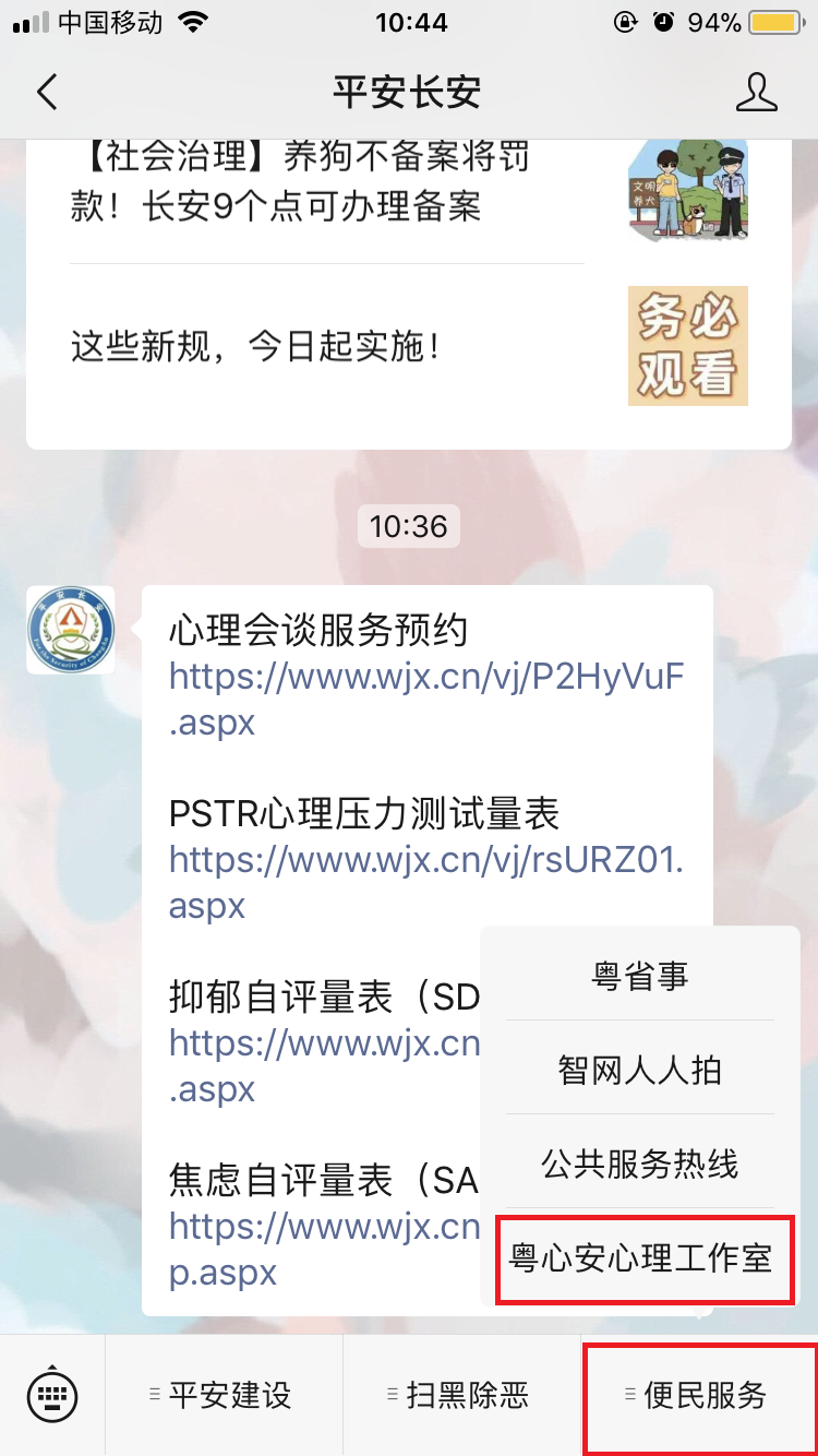 平安长安微信公众号平台已设置粤心安心理工作室栏目,满足线上预约及线上测评功能,目前,我镇已有164人次在线上服务平台进行心理量表测评。