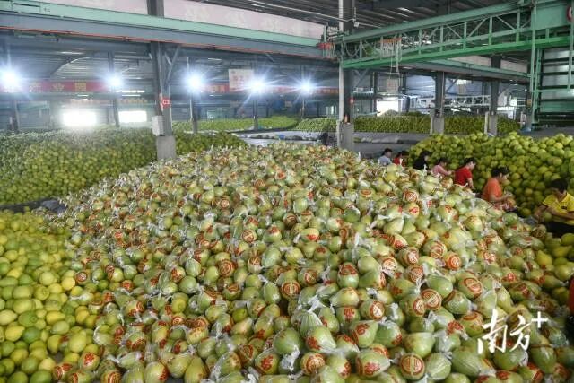 在梅州市梅县区雁洋镇南福金柚公园,村落房前屋后、田园山坡尽是被成熟柚果压弯了枝头的柚子树,果实在阳光照耀下闪闪发光,周围的柚农或摘柚子,或挑柚子,一派忙碌的丰收景象。
