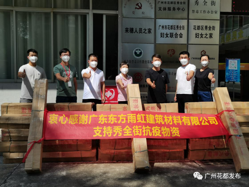 10月20日-25日,广东东方雨虹建筑材料有限公司向炭步镇鸭湖村和鸭一村捐赠100箱方便面,100箱矿泉水,40箱饼干,12顶帐篷;向秀全街道、花都区质监站捐赠95顶防疫帐篷。