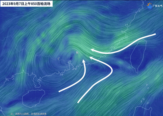 从今天(9月7日)的流场图可见,残余涡旋东侧有多支气流汇合,充沛的水汽是导致强降雨的因素之一。