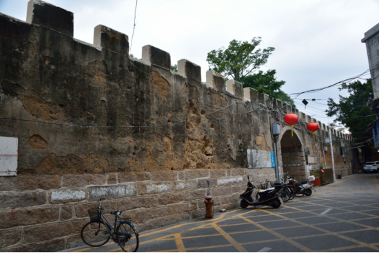 招收城呈正方形,城墙高5.3米,厚1.35米,墙顶还设有城堞。城墙下半部用石块垒砌,上半部用贝灰、粗砂和黏土夯筑。城设东、西二城门,东门称“达善门”,西门叫“西濠门”,为高3米、宽4.5米、厚4.3米的石拱门。原来城门上筑有城楼,向外是布满枪眼的高墙,对内是重檐三开间大厅,现已无存。城的四个角都筑有了望平台,其中东南角平台最大,面积达200多平方米,均无存。从东门到西门有一条长约100米、宽3米的小路相通,就是小城唯一的街道。建城后实行守更制,每夜戌时起更,更楼开始敲鼓,鼓点由疏而密,由慢而急,均以“精忠报国”鼓谱为依据,实行宵禁,按时巡更,直至五更打启明鼓才解禁。如此森严的城防措施,实在不切合渔、盐民的作息。尽管如此,明眼人也不难看出城池的破绽,它北靠山地,远离海岸;城西的民居与城墙只隔一条一米见宽的巷道,民居的山墙几乎与城墙—样高。这样的城池义能有多少防御能力?然而,朝廷分配下来的原本用于修建古城的财物还绰绰有余,是被许颖假公济私独吞了吗?当然不是,许颖根据达濠鱼岛附近的环境,修建了一条大约20多里的长堤,使当地居民免受了潮水之灾。