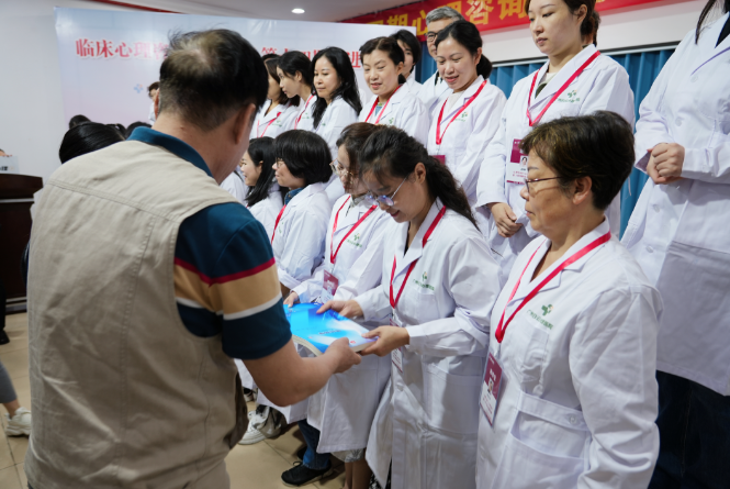 学员们郑重地穿上白大褂,郑洪波教授分发课程书籍,书籍涵盖了心理学、精神医学的各个方面,包括心理咨询基本功、精神分析治疗、认知行为治疗、精神障碍症状学、精神障碍的检查与诊断等,为学员们的学习提供了强有力的支持。