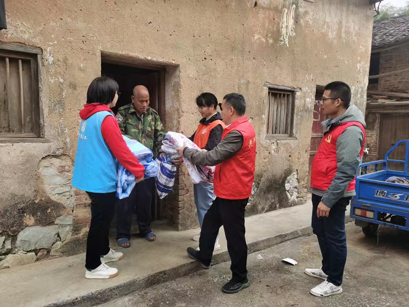 英德党员干部和志愿者为困难群众送上御寒棉被。